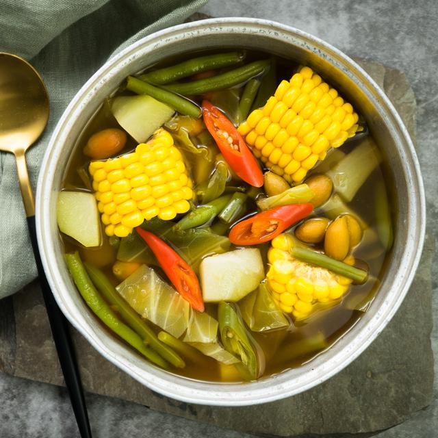 - Masukkan labu silam, kacang panjang dan jagung manis