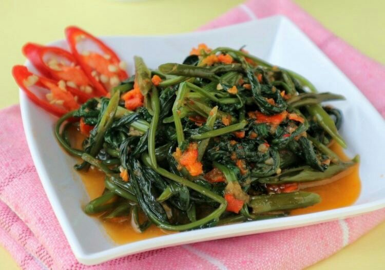 2. Tumis bawang merah, putih, cabai, lengkuas, daun salam, saos tiram, aduk sampai wangi kemudian masukkan batang kangkung dan aduk lagi